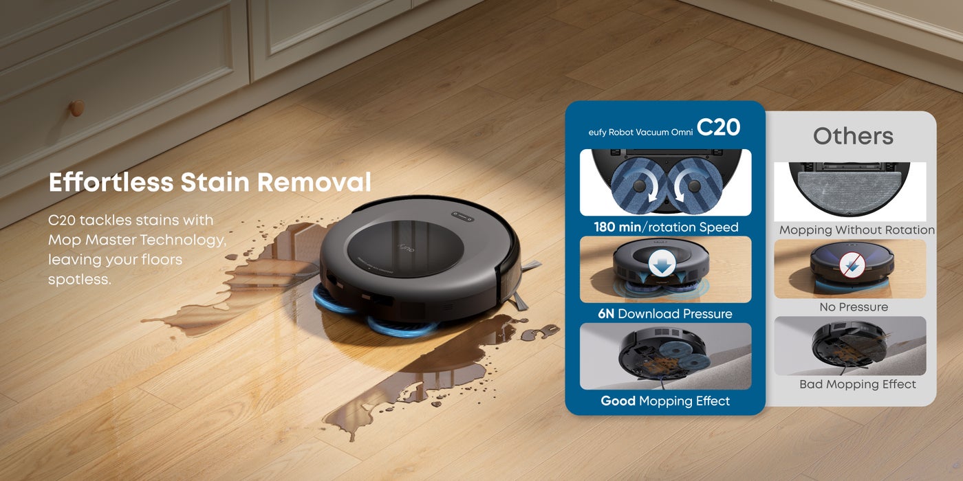 • Mop Master Technology: With 180 rotations per minute and 6N of pressure, Omni C20 effortlessly removes stains. It features dual sweeping and mopping modules, allowing simultaneous cleaning through the app and maximizing efficiency.