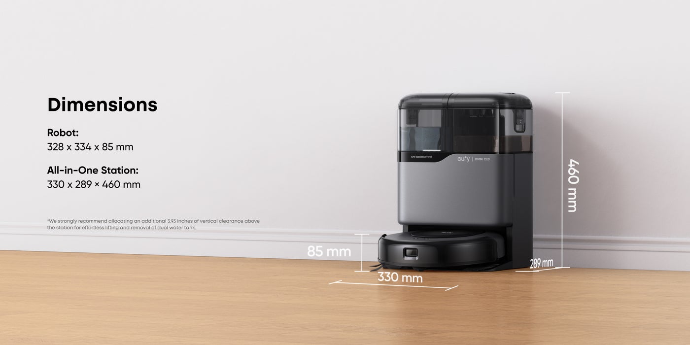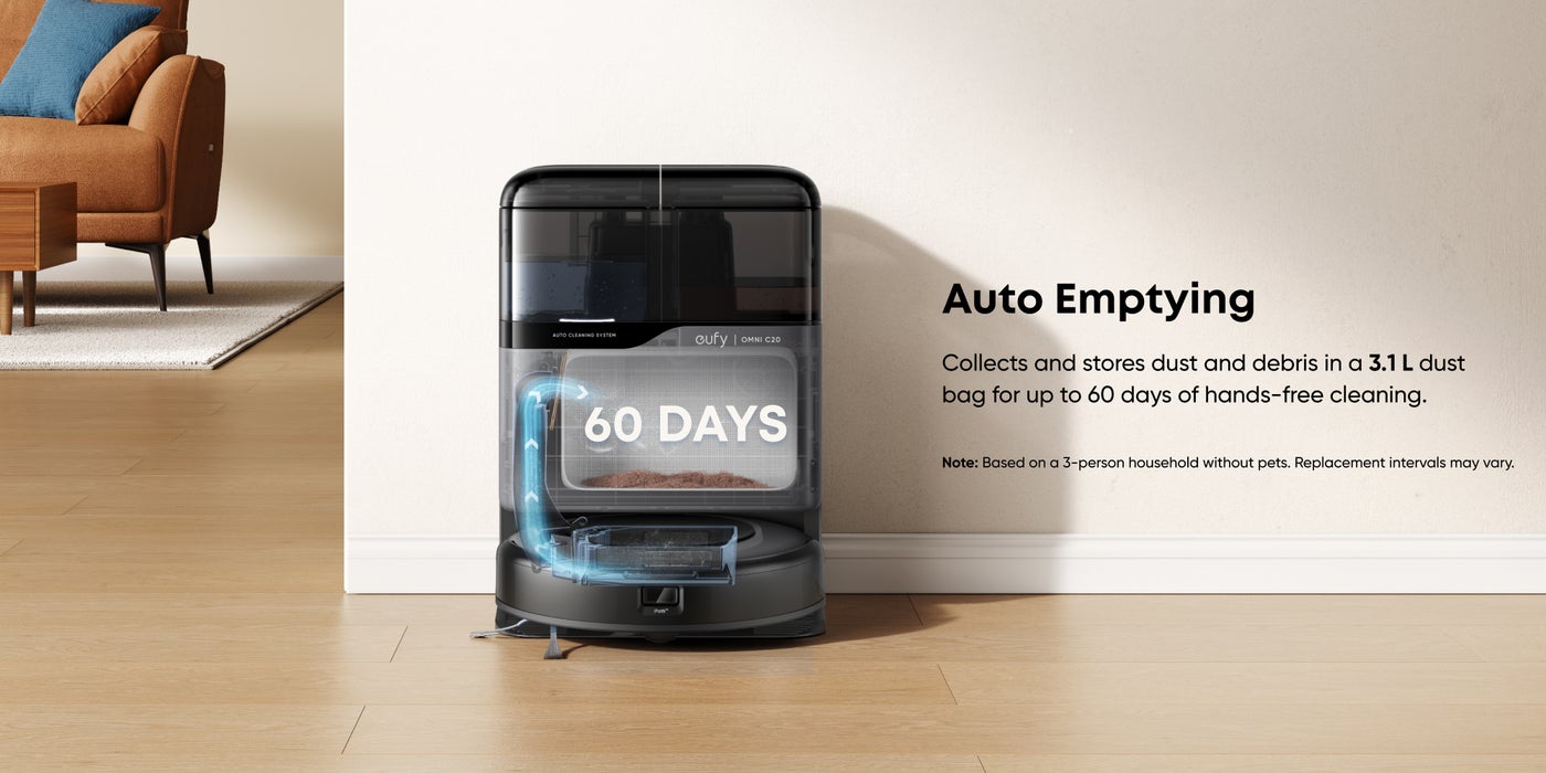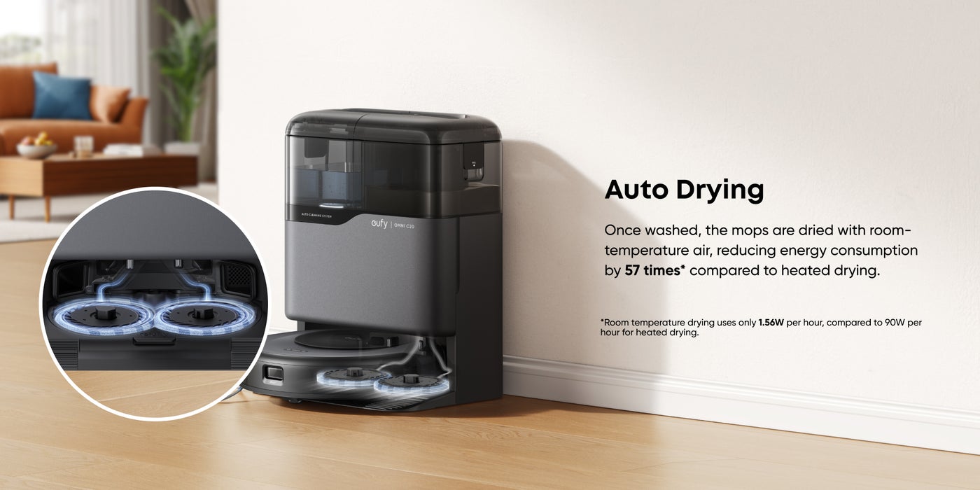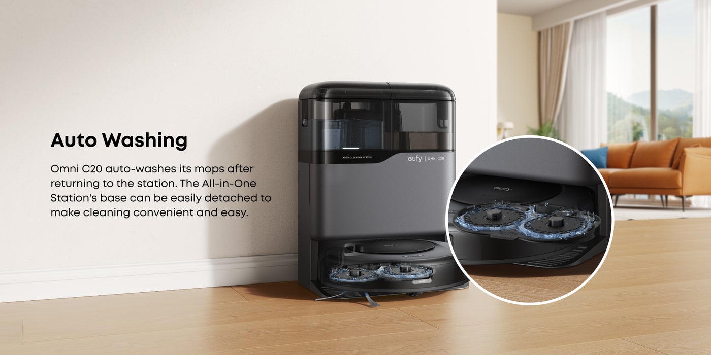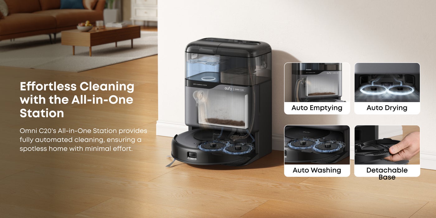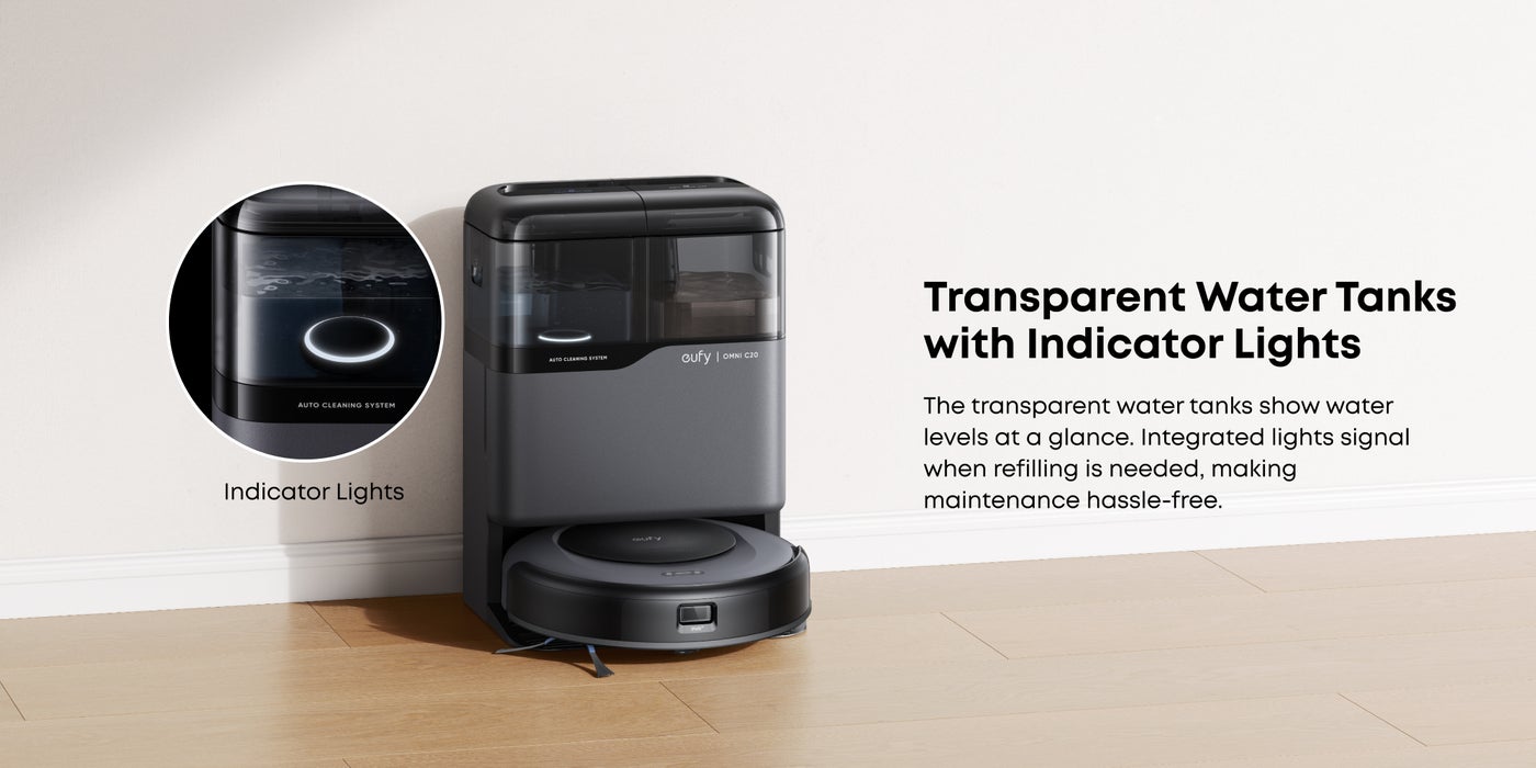 • All-in-One Station: eufy Robot Vacuum Omni C20 offers fully automated cleaning with features like auto emptying, washing, drying, and water refilling. The station dries the mop with room-temperature air and has transparent water tanks, allowing you to easily monitor water levels without opening them. This hands-free system ensures effortless maintenance.