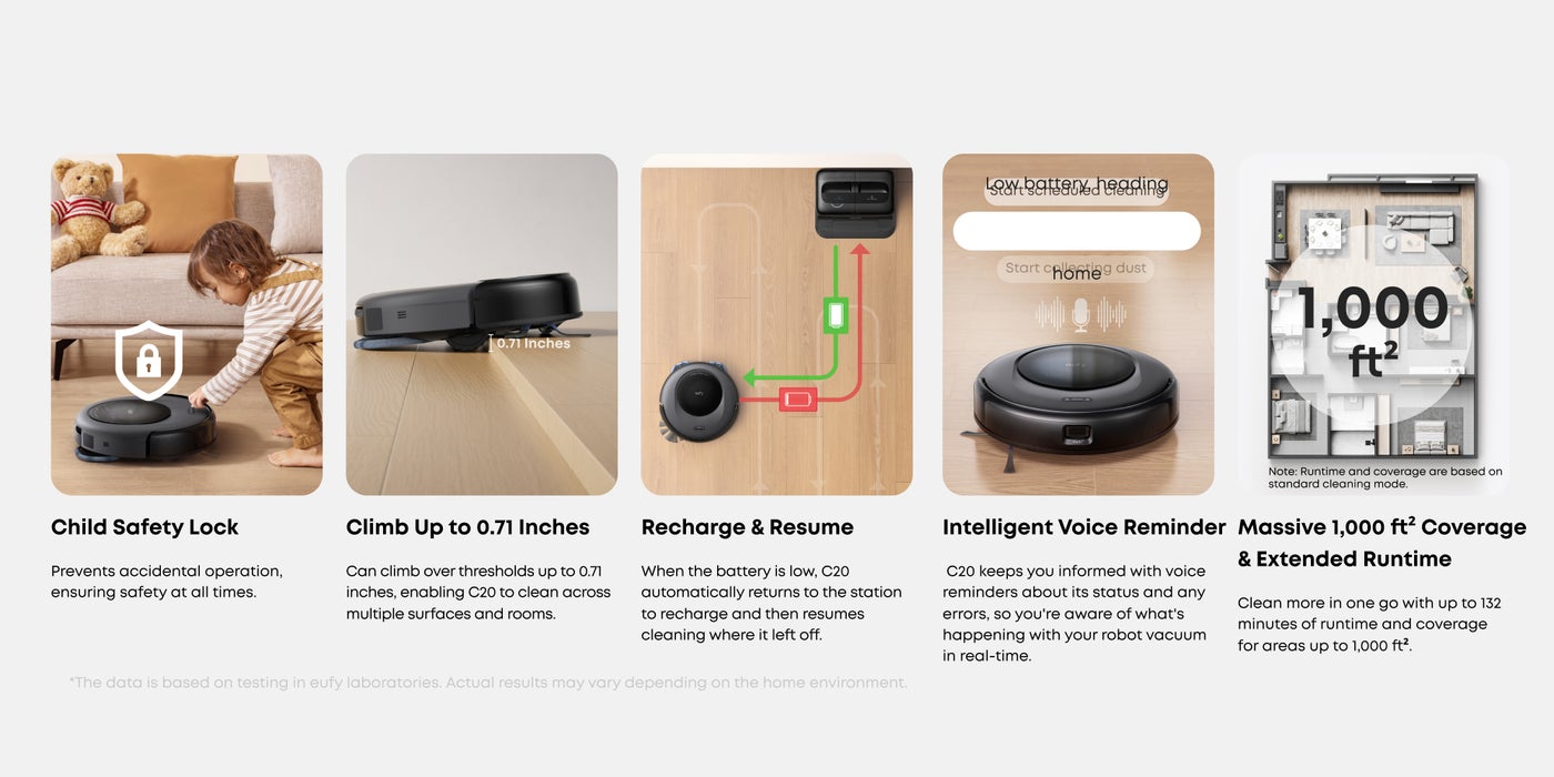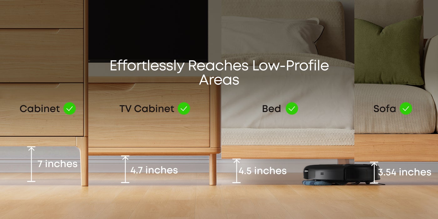 • 3.35-inch Ultra-Slim Body: Its ultra-slim 3.35-inch design allows the C20 to reach tight spaces, like under desks and beds, ensuring thorough cleaning in hard-to-reach areas and reducing manual cleaning in low-profile furniture spaces.