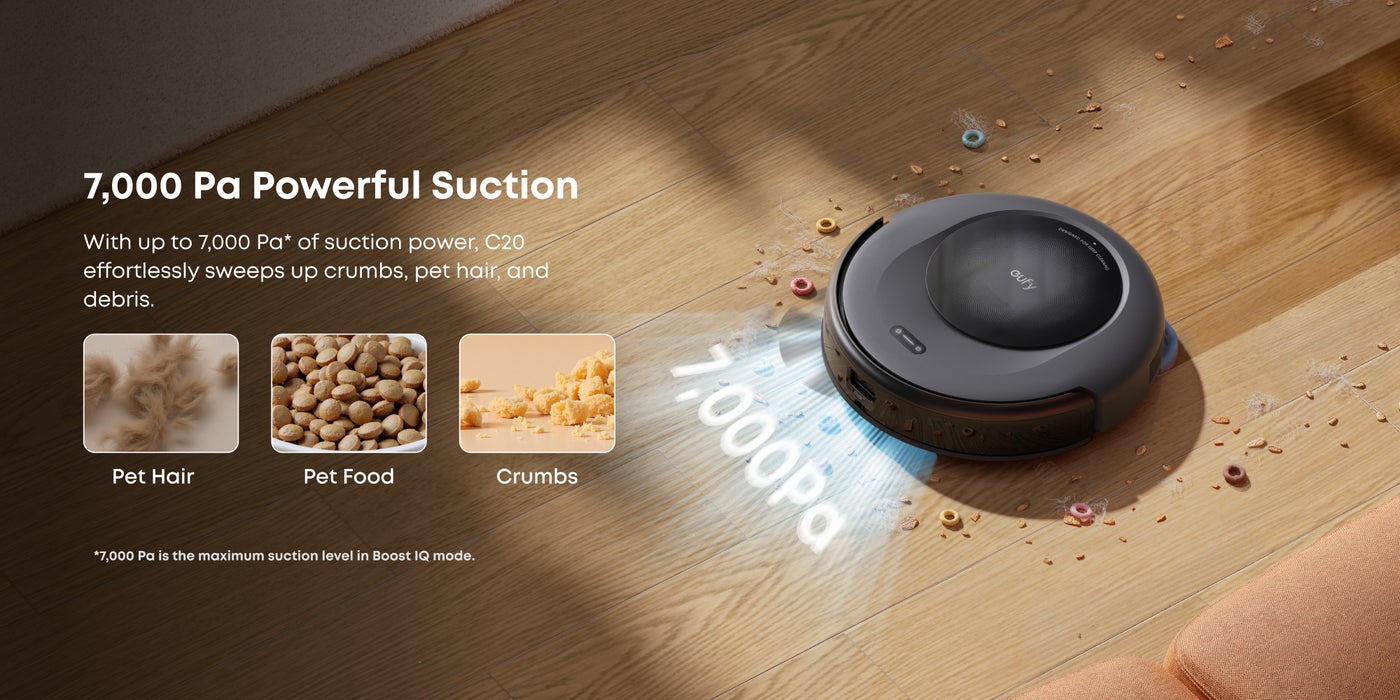 • 7,000 Pa Powerful Suction: Equipped with a robust 7,000 Pa suction, a rolling brush, and a side brush, C20 efficiently tackles dirt, crumbs, pet hair, and debris.