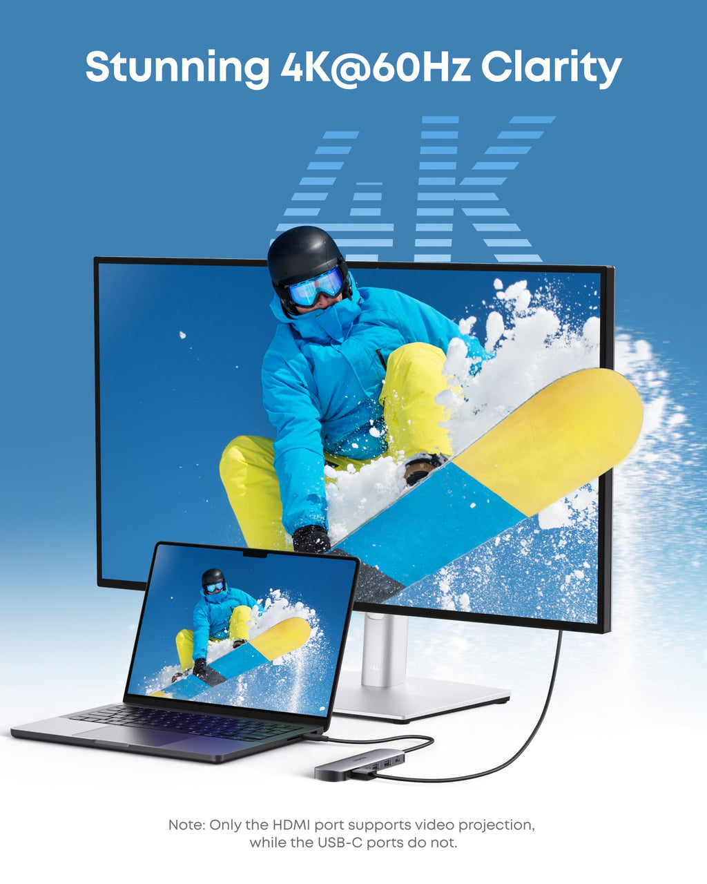 Delivers exceptional clarity and smoothness with its 4K@60Hz HDMI port, making it ideal for high-definition presentations and entertainment. (Note: Only the HDMI port supports video projection; the USB-C port is for data transfer only.)