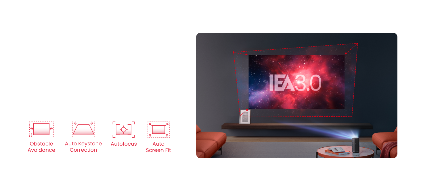 Set Up in Seconds: Our Intelligent Environment Adaptation Technology performs screen fit, auto keystone correction, autofocus, and obstacle avoidance in just 3 seconds.